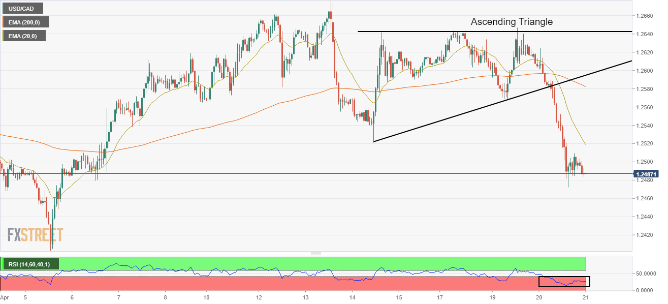 Penembusan sisi bawah dari pola segitiga naik telah melemahkan para pembeli greenback. Situasi overbought di RSI (14) mengindikasikan pullback ke 20-EMA. Tren bearish yang lebih luas akan tetap utuh sampai aset ini diperdagangkan di bawah EMA 200. Pasangan USD/CAD telah menyaksikan penurunan vertikal setelah beberapa upaya gagal di atas 1,2647 sejak 14 April. Aset telah jatuh di bawah 1,2500 dan mengincar lebih banyak penurunan mengingat aksi harga. Ledakan formasi grafik segitiga naik di sisi bawah melemahkan bulls greenback. Resistensi horizontal dari pola grafik yang disebutkan di atas ditempatkan dari tinggi 14 April di 1,2642 sedangkan garis tren naik diplot dari terendah 14 April di 1,2521. Aset telah menampilkan jenis penjualan buku teks setelah menembus di bawah segitiga naik. Persilangan bearish dari Exponential Moving Averages (EMA) periode 20 dan 200 di 1,2596 memicu aksi jual yang intens pada aset. Relative Strength Index (RSI) (14) berosilasi dalam kisaran bearish 20.00-40.00, yang dapat mengakibatkan pullback kecil karena situasi oversold akan dimulai. Para investor harus fokus pada pullback menuju EMA 20 di 1,2520, yang akan menjadi peluang penjualan yang optimal. Setelah menekan EMA20, munculnya para penjual potensial akan menyeret aset ini menuju terendah Maret di 1,2430, diikuti oleh support level angka bulat di 1,2400. Sebaliknya, para pembeli greenback bisa mendapatkan kembali kendali jika aset ini melampaui terendah Jumat di 1,2590, yang akan mendorong pasangan mata uang ini menuju 14 April dan tertinggi April masing-masing di 1,2642 dan 1,2676 . Grafik Per Jam USD/CAD Level-Level Teknis USD/CAD Tinjauan Harga terakhir hari ini 1.2494 Perubahan harian hari ini -0.0005 Perubahan harian hari ini % -0.04 Pembukaan harian hari ini 1.2499 Tren SMA 20 Harian 1.2549 SMA 50 Harian 1.2651 SMA 100 Harian 1.2681 SMA 200 Harian 1.2628 Level Tinggi Harian Sebelumnya 1.2625 Rendah Harian Sebelumnya 1.2472 Tinggi Mingguan Sebelumnya 1.2676 Rendah Mingguan Sebelumnya 1.2521 Tinggi Bulanan Sebelumnya 1.2901 Rendah Bulanan Sebelumnya 1.243 Fibonacci Harian 38,2% 1.253 Fibonacci Harian 61,8% 1.2566 Pivot Point Harian S1 1.2439 Pivot Point Harian S2 1.2379 Pivot Point Harian S3 1.2286 Pivot Point Harian R1 1.2592 Pivot Point Harian R2 1.2684 Pivot Point Harian R3 1.2744