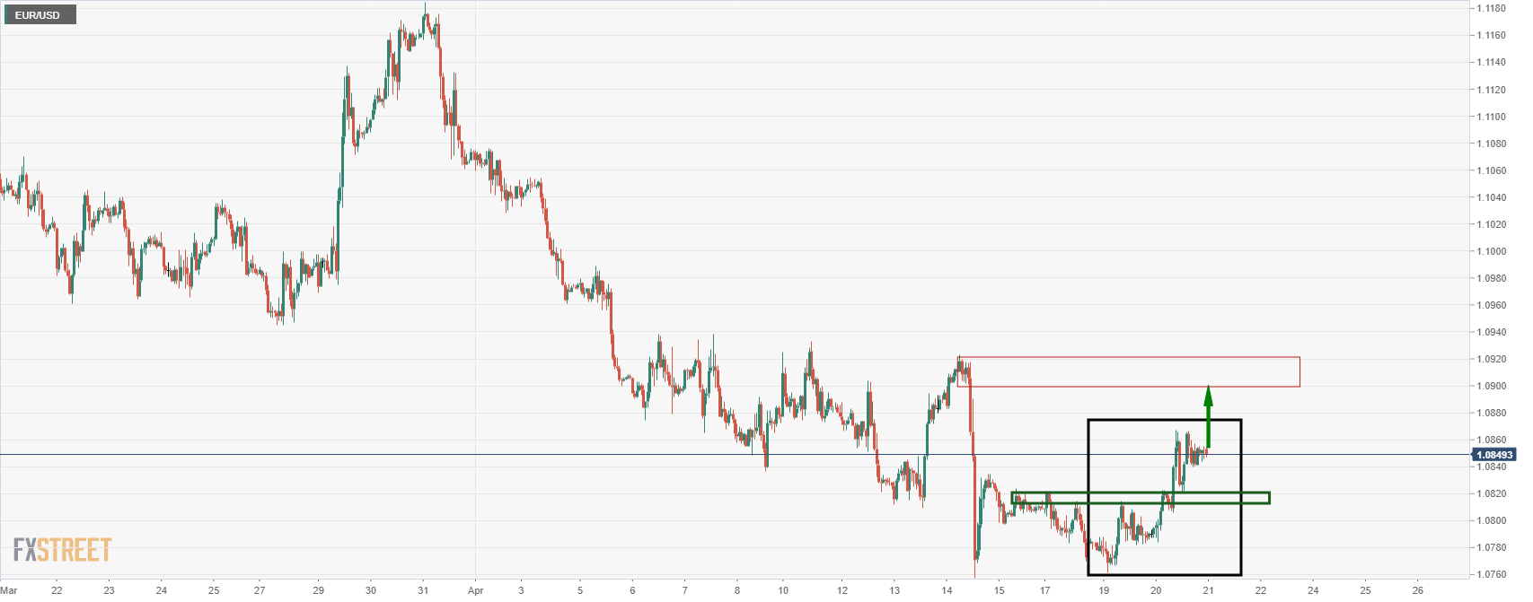 Para pembeli EUR/USD kehilangan pegangan tetapi bisa saja akan masuk lagi. Pemilihan Perancis adalah bullish untuk euro meskipun dolar AS tetap menjadi kendala. Penjual EUR/USD telah menggertakkan gigi mereka dan menggeram dalam menghadapi desakan bullish, yang baru-baru ini mengirim euro ke posisi mundur meskipun ada prospek yang menguntungkan dalam pemilihan Prancis. Pada saat penulisan, EUR/USD diperdagangkan di sekitar 1,8040, rasio 61,8% dari dorongan bullish sebelumnya. Pasangan mata uang ini telah meluncur dari tertinggi 1,0854 dan telah mencatat terendah 1,0838 dalam perdagangan baru-baru ini. Kedua finalis dalam pemilihan presiden Prancis berhadapan dalam debat TV langsung yang bisa menjadi sangat penting dalam membujuk pemilih yang ragu – terutama di sayap kiri – empat hari sebelum pemungutan suara putaran kedua yang menentukan. Jajak pendapat: Macron Tampil dalam Debat Pemilihan, Baik untuk Euro Namun, terlepas dari dukungan dalam jajak pendapat untuk Macron, euro tergelincir. Imbal hasil AS telah muncul dalam perdagangan baru-baru ini dan juga ini telah menarik dolar AS dari dasar. DXY, dalam indeks yang mengukur greenback versus sekeranjang mata uang lainnya, menembus 100,50 pada saat penulisan, naik dari terendah 100,34 hari ini. Ada ekspektasi perbaikan lemah lainnya dari People's Bank of China yang akan menjadi positif dolar AS pada fakta dan berpotensi memberikan beberapa dukungan untuk spekulasi. Namun demikian, pergerakan tersebut menyinari prospek bullish jangka pendek bagi euro, dari sudut pandang teknis: Analisis Teknis EUR/USD Harga telah kembali ke area support, mencatat titik terendah baru untuk support dan mengambil rasio 61,8%. Namun, harga telah meninggalkan formasi M yang diperkirakan akan melihat pengujian ulang neckline: Mengingat tren bullish, neckline ini dapat berfungsi sebagai resistance sementara dan memberi jalan bagi para pembeli, menghasilkan kelanjutan bullish untuk sesi mendatang.