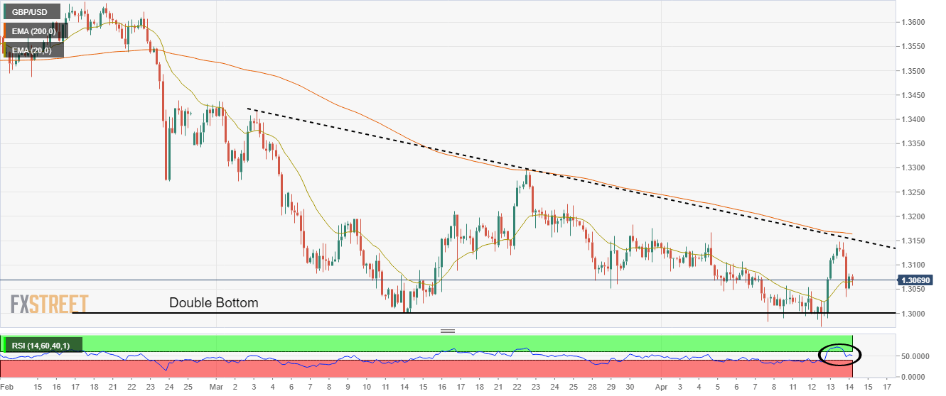 Sebuah kenaikan tipis setelah formasi double bottom telah menganjurkan pembalikan yang kuat. Sebuah gerakan keras yang ditampilkan oleh RSI (14) mengekspresikan pergeseran dominasi. Pembeli Pound menawarkan pembelian murah kepada investor setelah pullback di EMA-20. Pasangan GBP/USD menghadapi tindakan korektif setelah reli raksasa dari level terendah Rabu di 1,2973. Cable telah dikoreksi ke Exponential Moving Average (EMA) hampir 20 periode dan memberikan kesempatan optimal bagi investor Pound untuk memasuki pembalikan yang lebih kuat. Formasi double bottom pada grafik empat jam tampaknya menguntungkan pembeli Cable. Pasangan ini telah menunjukkan kenaikan tipis setelah menguji kembali posisi terendah Maret di sekitar support psikologis 1,3000. Pola grafik double bottom menandakan pembalikan bullish di tengah tidak adanya penjual bervolume tinggi saat menguji r-bottom kritis. Garis tren yang ditempatkan dari tertinggi 3 Maret di 1,3418, berdampingan dengan tertinggi 23 Maret di 1,3299 akan terus bertindak sebagai barikade utama. Pergerakan keras dalam osilator momentum, Relative Strength Index (RSI) (14) menunjukkan pergeseran dari dominasi penjual. Pullback korektif menuju EMA-20 di 1,3068 terlihat seperti pembelian optimal bagi investor. Ini akan mendorong aset menuju resistensi level bulat di 1.3100, diikuti oleh EMA-200 di 1,3165. Di sisi lain, penurunan di bawah level terendah 8 April di 1,2982 akan memicu pembeli Greenback, yang akan mengirim aset menuju level terendah 2 November 2020 dan support level bulat di 1,2854 dan 1,2800. Grafik empat jam GBP/USD Level Teknis GBP/USD Tinjauan Harga terakhir hari ini 1.3069 Perubahan harian hari ini -3 Perubahan harian hari ini % -0.02 Pembukaan harian hari ini 1.3072 Tren SMA 20 Harian 1.3116 SMA 50 Harian 1.3271 SMA 100 Harian 1.3352 SMA 200 Harian 1.3526 Level Tinggi Harian Sebelumnya 1.3147 Rendah Harian Sebelumnya 1.3034 Tinggi Mingguan Sebelumnya 1.3167 Rendah Mingguan Sebelumnya 1.2982 Tinggi Bulanan Sebelumnya 1.3438 Rendah Bulanan Sebelumnya 1.3 Fibonacci Harian 38,2% 1.3077 Fibonacci Harian 61,8% 1.3104 Pivot Point Harian S1 1.3021 Pivot Point Harian S2 1.2971 Pivot Point Harian S3 1.2908 Pivot Point Harian R1 1.3135 Pivot Point Harian R2 1.3198 Pivot Point Harian R3 1.3248