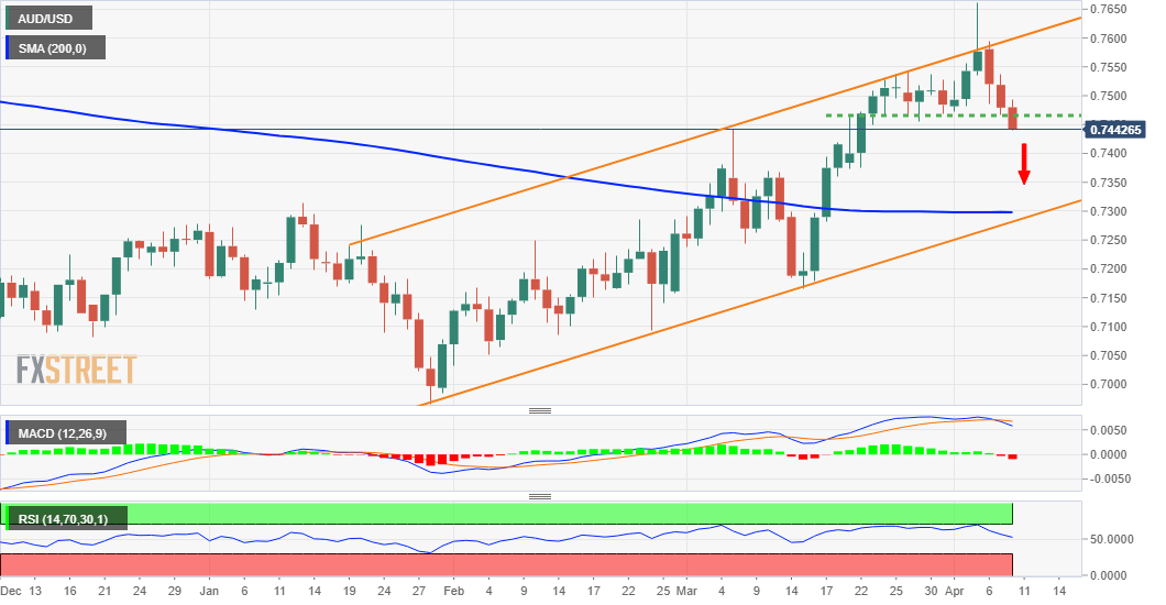AUD/USD memperpanjang pullback baru-baru ini dari tertinggi tahun dan turun ke terendah hampir tiga minggu. Penerimaan di bawah 0,7500 dan penurunan setelahnya telah menggeser bias mendukung pedagang bearish. Upaya pemulihan dapat menarik aksi jual baru dan tetap dibatasi di dekat area 0,7535-40. Pasangan AUD/USD memperpanjang penurunan tajam minggu ini dari puncak tahun – level-level tepat di atas pertengahan 0,76 – dan mengalami beberapa aksi jual untuk hari ketiga berturut-turut pada hari Jumat. Lintasan ke bawah menyeret harga spot ke terendah dua setengah minggu, di sekitar wilayah 0,7440-0,7435 selama awal sesi Amerika Utara. Risalah FOMC yang lebih hawkish, bersama dengan kenaikan berkelanjutan dalam imbal hasil obligasi Pemerintah AS, mendorong dolar AS ke level tertinggi sejak Mei 2020. Itu, pada gilirannya, dilihat sebagai faktor utama yang memberikan tekanan ke bawah pada pasangan AUD/USD. Pembeli tampaknya tidak terkesan oleh nada risiko positif, yang cenderung menguntungkan dolar Australia yang dianggap lebih berisiko. Penurunan yang sedang berlangsung mengindikasikan bahwa pergerakan kuat pasca-RBA pada hari Selasa di luar saluran menanjak yang memanjang dari terendah tahun adalah penembusan palsu. Beberapa tindak lanjut aksi jual di bawah 0,7500 mungkin telah menggeser bias mendukung pedagang bearish. Penembusan berikutnya melewati zona support horizontal 0,7450 menegaskan kembali prospek negatif. Oleh karena itu, pullback korektif tampaknya lebih mungkin diperpanjang menuju angka bulat 0,7400 sebelum pasangan AUD/USD akhirnya turun ke area 0,7375-0,7370. Support relevan berikutnya dipatok di dekat wilayah pertemuan 0,7300, yang terdiri dari SMA 200-hari yang sangat penting dan batas bawah saluran tren yang disebutkan di atas. Di sisi lain, level 0,7500 sekarang tampaknya bertindak sebagai resistance kuat langsung. Pemulihan lebih lanjut dapat menarik aksi jual baru dan tetap dibatasi di dekat zona 0,7535-0,7545. Penguatan berkelanjutan di atasnya seharusnya memungkinkan pasangan AUD/USD untuk merebut kembali 0,7600, yang bertepatan dengan resistance saluran dan bertindak sebagai titik penting. Grafik harian AUD/USD level-level teknis AUD/USD Tinjauan Harga terakhir hari ini 0.7436 Perubahan harian hari ini -0.0043 Perubahan harian hari ini % -0.57 Pembukaan harian hari ini 0.7479 Tren SMA 20 Harian 0.7438 SMA 50 Harian 0.7294 SMA 100 Harian 0.7235 SMA 200 Harian 0.7298 Level Tinggi Harian Sebelumnya 0.7537 Rendah Harian Sebelumnya 0.7466 Tinggi Mingguan Sebelumnya 0.7541 Rendah Mingguan Sebelumnya 0.7455 Tinggi Bulanan Sebelumnya 0.7541 Rendah Bulanan Sebelumnya 0.7165 Fibonacci Harian 38,2% 0.7493 Fibonacci Harian 61,8% 0.751 Pivot Point Harian S1 0.7451 Pivot Point Harian S2 0.7423 Pivot Point Harian S3 0.738 Pivot Point Harian R1 0.7522 Pivot Point Harian R2 0.7566 Pivot Point Harian R3 0.7594