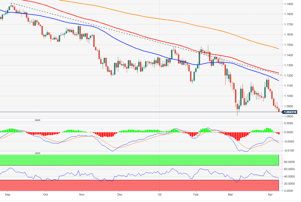 EUR/USD turun lebih jauh dan mencetak terendah baru di dekat 1,0840. Penurunan lebih lanjut dapat melihat terendah 2022 dikunjungi kembali. EUR/USD melanjutkan pergerakan bearish ke terendah baru multi-minggu di kisaran 1,0845/40 pada hari Jumat. Mempertimbangkan aksi harga yang sedang berlangsung, penurunan lebih lanjut tetap mungkin terjadi dalam pasangan mata uang ini dalam horizon jangka pendek. Bisa dibilang, terendah 2022 di 1,0805 (7 Maret) adalah yang berikutnya diikuti oleh terendah Mei 2020 di 1,0766 (7 Mei). Prospek negatif jangka menengah untuk EUR/USD diperkirakan akan tetap tidak berubah ketika di bawah SMA 200-hari utama, hari ini di 1,1459. Grafik harian EUR/USD level-level teknis EUR/USD Tinjauan Harga terakhir hari ini 1.0846 Perubahan harian hari ini -0.0033 Perubahan harian hari ini % -0.30 Pembukaan harian hari ini 1.0879 Tren SMA 20 Harian 1.1 SMA 50 Harian 1.1146 SMA 100 Harian 1.1228 SMA 200 Harian 1.1466 Level Tinggi Harian Sebelumnya 1.0939 Rendah Harian Sebelumnya 1.0865 Tinggi Mingguan Sebelumnya 1.1185 Rendah Mingguan Sebelumnya 1.0945 Tinggi Bulanan Sebelumnya 1.1233 Rendah Bulanan Sebelumnya 1.0806 Fibonacci Harian 38,2% 1.0893 Fibonacci Harian 61,8% 1.091 Pivot Point Harian S1 1.0849 Pivot Point Harian S2 1.082 Pivot Point Harian S3 1.0776 Pivot Point Harian R1 1.0923 Pivot Point Harian R2 1.0968 Pivot Point Harian R3 1.0997