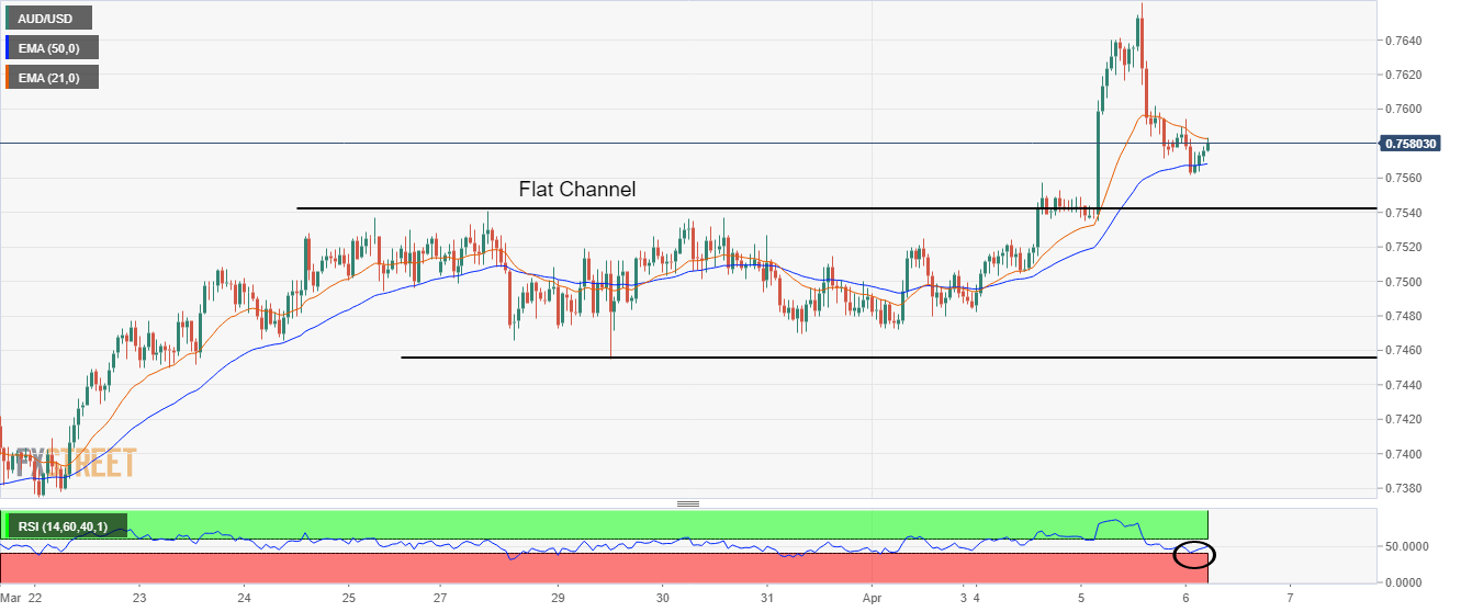 EMA-50 telah bertindak sebagai penghalang bagi pembeli greenback. Support di 40,00 oleh RSI (14) mengindikasikan konsolidasi ke depan. Penembusan saluran datar menyerukan pengujian ulang untuk mementaskan rally baru. Pasangan AUD/USD telah mengalami sesi uji coba terbuka bearish pada hari Rabu. Pasangan mata uang ini dibuka di 0,7585 dan mencatat tertinggi di 0,7594. Kemudian, ia mengalami sell-off yang intens, yang menyeret aset ke terendah 0,7561. Pembeli dolar Australia mendapatkan bantalan setelah menghadapi Exponential Moving Average (EMA) 50-periode, yang saat ini di 0,7569. Pada grafik per jam, AUD/USD telah mencatat kenaikan yang kuat setelah menembus saluran datar yang berada di kisaran 0,7455-0,7546. Biasanya, penembusan pola konsolidasi diikuti oleh pengujian ulang batas atas pola grafik. Aset mengalami koreksi dan turun ke dekat batas atas saluran datar di 0,7455. Relative Strength Index (RSI) telah merasakan support di dekat 40,00, yang mengindikasikan pembeli greenback kehilangan momentum. Sementara itu, Exponential Moving Averages (EMA) 20- dan 50-periode masing-masing di 0,7583 dan 0,7569 telah berubah datar, yang memberi sinyal konsolidasi ke depan. Pengujian ulang saluran datar di 0,7541 akan memicu peluang beli murah bagi pelaku pasar, yang akan mendorong aset menuju tertinggi Rabu di 0,7662. Penembusan level tersebut akan mengirim pasangan mata uang ini menuju tertinggi 11 Juni 2021 di 0,7776. Di sisi lain, pembeli dolar Australia dapat kehilangan kekuatan jika aset turun di bawah terendah 29 Maret di 0,7455, yang akan menyeret aset menuju tertinggi 10 Maret di 0,7369, diikuti oleh support angka bulat di 0,7300. Grafik per jam AUD/USD level-level teknis AUD/USD Tinjauan Harga terakhir hari ini 0.7579 Perubahan harian hari ini 0.0002 Perubahan harian hari ini % 0.03 Pembukaan harian hari ini 0.7577 Tren SMA 20 Harian 0.7422 SMA 50 Harian 0.7277 SMA 100 Harian 0.7231 SMA 200 Harian 0.7298 Level Tinggi Harian Sebelumnya 0.7662 Rendah Harian Sebelumnya 0.7535 Tinggi Mingguan Sebelumnya 0.7541 Rendah Mingguan Sebelumnya 0.7455 Tinggi Bulanan Sebelumnya 0.7541 Rendah Bulanan Sebelumnya 0.7165 Fibonacci Harian 38,2% 0.7613 Fibonacci Harian 61,8% 0.7584 Pivot Point Harian S1 0.752 Pivot Point Harian S2 0.7464 Pivot Point Harian S3 0.7393 Pivot Point Harian R1 0.7647 Pivot Point Harian R2 0.7718 Pivot Point Harian R3 0.7774