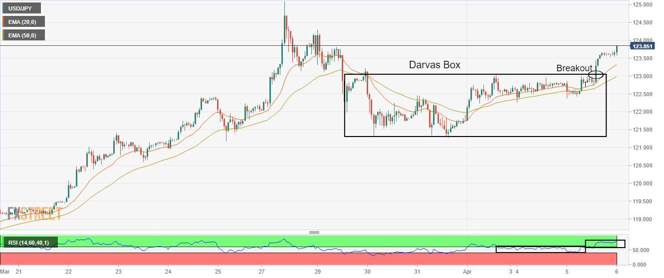 Tertembusnya formasi grafik kotak Darvas telah membuat aset ini tidak seimbang. Kenaikan EMA 20 dan 50 periode mengklaim bahwa sisi atas masih utuh. RSI (14) telah menetap di kisaran bullish di 60,00-80,00. Pasangan USD/JPY telah berubah menjadi tidak seimbang dan mendekati level tertinggi baru enam tahun di 125,10, yang tercatat pada 28 Maret setelah diperdagangkan dalam kotak kisaran sempit. Pasangan mata uang ini menyaksikan sesi penolakan pembalikan bullish pada hari Selasa karena aset ini bergerak lebih rendah setelah dibuka pada 122,80. Namun, mata uang utama menghadapi tawaran beli yang signifikan mendekati 122,38 karena para investor lebih suka pendekatan 'beli saat harga turun'. Struktur pada skala per jam menampilkan penembusan yang lebih kuat dari pola grafik kotak Darvas, yang diplot dalam kisaran 121,30-123,00. Meledaknya pola grafik kotak Darvas menghasilkan perluasan volume dan volatilitas. Exponential Moving Averages (EMA) 20 dan 50 periode di 123,35 dan 123,00 masing-masing terus bergerak lebih tinggi, yang menandakan bahwa bias bullish masih utuh. Sementara itu, Relative Strength Index (RSI) (14) telah nyaman menetap di kisaran bullish 60,00-80,00, yang menunjukkan lebih banyak kenaikan di depan. Pelanggaran level resistance angka bulat di 124,00 akan mendorong aset ini menuju level tertinggi enam tahun di 125,10, diikuti oleh tertinggi 1 Juni 2015 di 125,86. Sebaliknya, para pembeli yen dapat mendikte aset ini jika turun di bawah 50-EMA di 123,00. Hal tersebut akan mengirim aset ini menuju posisi terendah 29 Maret dan 30 Maret masing-masing di 121,98 dan 121,31. Grafik Per Jam USD/JPY Level-Level Teknis USD/JPY Tinjauan Harga terakhir hari ini 123.83 Perubahan harian hari ini 0.22 Perubahan harian hari ini % 0.18 Pembukaan harian hari ini 123.61 Tren SMA 20 Harian 120.36 SMA 50 Harian 117.27 SMA 100 Harian 115.78 SMA 200 Harian 113.49 Level Tinggi Harian Sebelumnya 123.67 Rendah Harian Sebelumnya 122.38 Tinggi Mingguan Sebelumnya 125.1 Rendah Mingguan Sebelumnya 121.28 Tinggi Bulanan Sebelumnya 125.1 Rendah Bulanan Sebelumnya 114.65 Fibonacci Harian 38,2% 123.17 Fibonacci Harian 61,8% 122.87 Pivot Point Harian S1 122.77 Pivot Point Harian S2 121.93 Pivot Point Harian S3 121.48 Pivot Point Harian R1 124.06 Pivot Point Harian R2 124.51 Pivot Point Harian R3 125.35