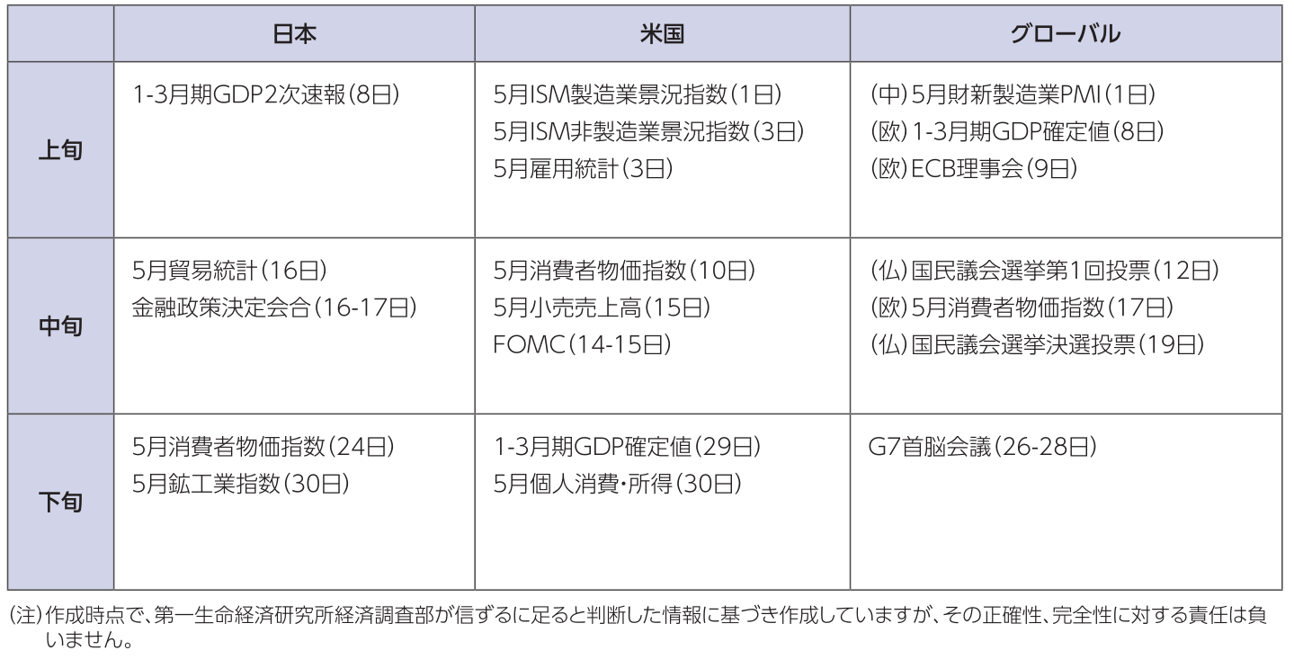 【日本】鉱工業生産・速報値(5月)8:50予想 -0.1% 前回 -1.5%(前月比)予想 4.2% 前回 -4.9%(前年比)【中国】製造業PMI(6月)10:30予想 50.4 前回 49.6 【英国】経常収支(第1四半期)15:00予想 -397.0億ポンド 前回 -73.0億ポンドGDP・確報値(第1四半期)15:00予想 0.8% 前回 0.8%(前期比)予想 8.7% 前回 8.7%(前年比)ネーションワイド住宅価格指数(6月)15:00予想 0.6% 前回 0.9%(前月比)予想 10.9% 前回 11.2%(前年比)【ユーロ圏】ドイツ小売売上高指数(5月)15:00予想 1.0% 前回 -5.4%(前月比)予想 -1.8% 前回 3.3%(前年比)ドイツ失業者数(6月)16:55予想 -0.3万人 前回 -0.4万人 ドイツ失業率(6月)16:55予想 5.0% 前回 5.0%ユーロ圏失業率(5月)18:00予想 6.7% 前回 6.8%【スイス】小売売上高(5月)15:30予想 N/A 前回 -6.0%(前年比)KOF先行指数(6月)16:00予想 96.2 前回 96.8【香港】小売売上高指数(5月)17:30予想 8.0% 前回 8.1%(数量ベース・前年比)予想 N/A 前回 11.7%(価額ベース・前年比)【南アフリカ】生産者物価指数(5月)18:30予想 1.5% 前回 1.8%(前月比)予想 14.0% 前回 13.1%(前年比)貿易収支(5月)21:00予想 261.0億ランド 前回 155.0億ランド【ブラジル】失業率(5月)21:00予想 10.2% 前回 10.5% 【カナダ】GDP(4月)21:30予想 3.0% 前回 0.7%(前月比)【米国】新規失業保険申請件数(25日までの週)21:30予想 23.0万件 前回 22.9万件(前...