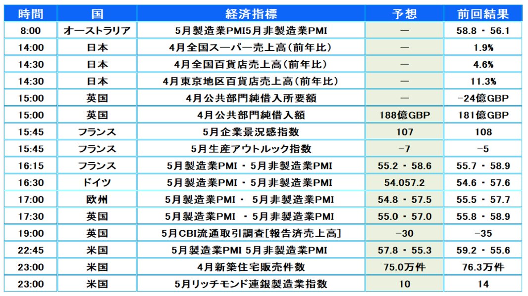 【ユーロ圏】ドイツGfk消費者信頼感(7月)15:00予想 -27.9 前回 -26.0【米国】卸売在庫・速報値(5月)21:30予想 2.2% 前回 2.2%(前月比)S&Pケースシラー住宅価格(4月)22:00予想 21.3% 前回 21.17%(20都市・前年比)コンファレンスボード消費者信頼感指数(6月)23:00予想 100.1 前回 106.4※予定は変更することがあります