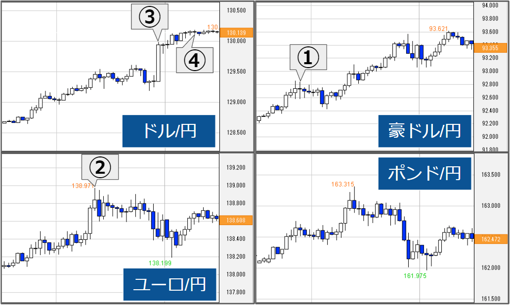 ドル円 ユーロドル ユーロ円始値 130.13 1.0650 138.58高値 130.24 1.0750 139.61安値 129.51 1.0645 138.39終値 129.84 1.0747 139.55