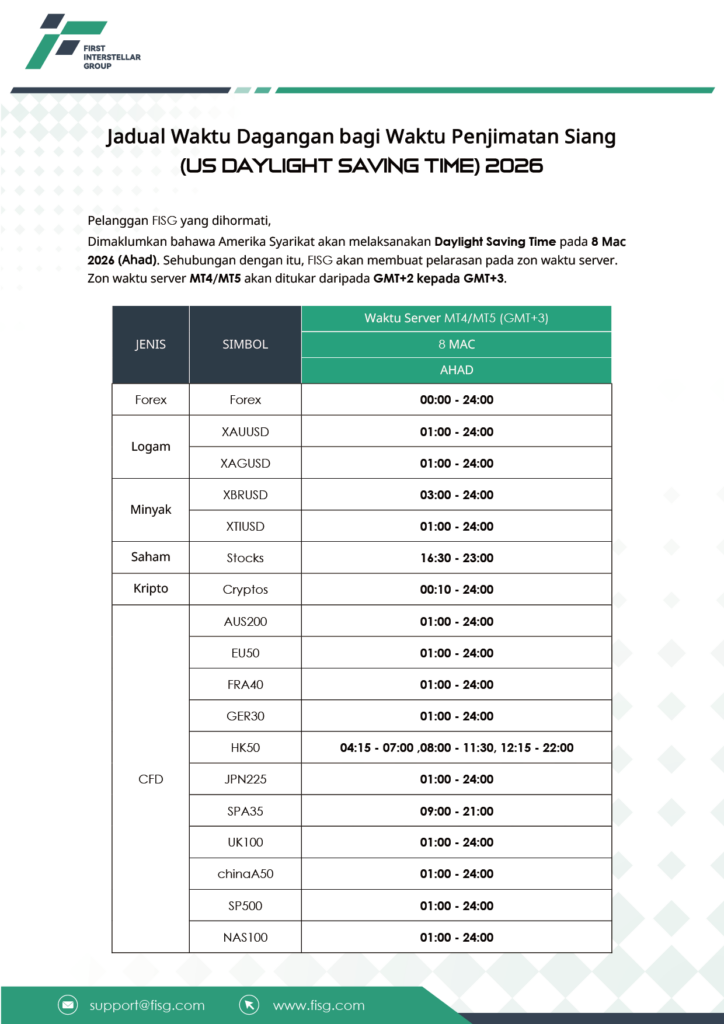 Jadual Waktu Dagangan bagi Waktu Penjimatan Siang (US Daylight Saving Time) 2026