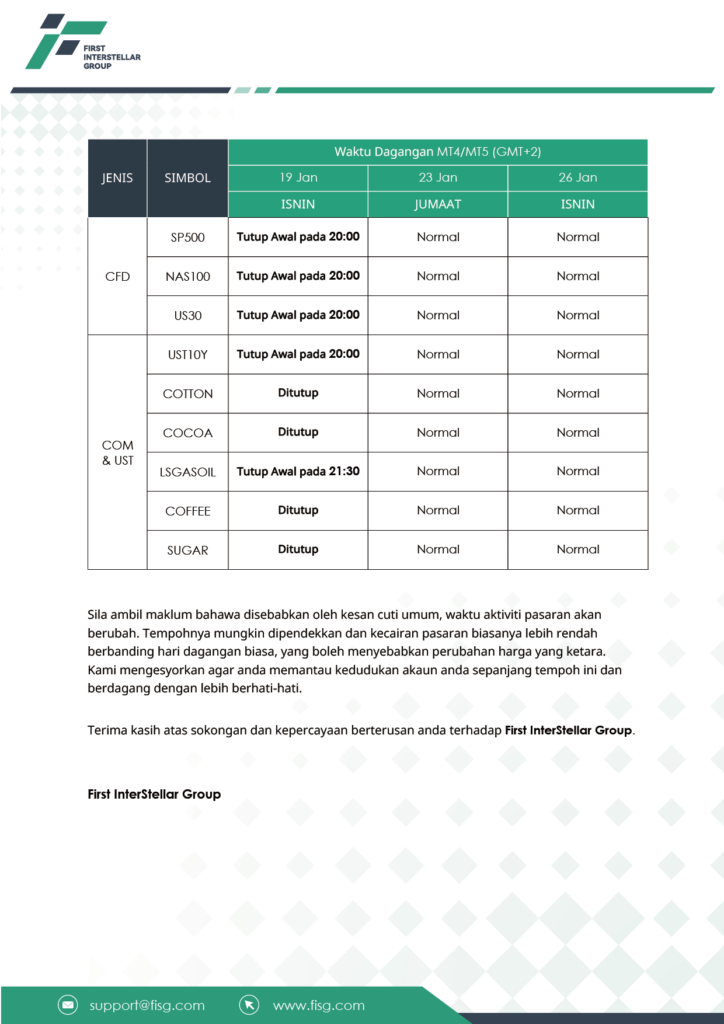 Jadual Waktu Dagangan SempenaHari Martin Luther King Jr. (AS)& Hari Australia 2026